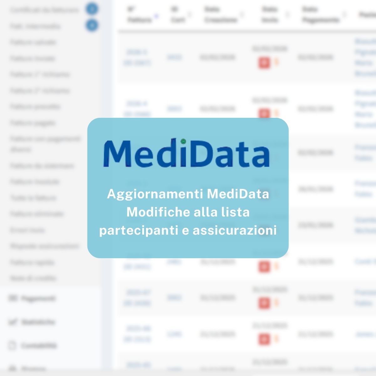 Generazione fatture pdf e elettroniche e con invio telematico mediante servizio Mediport (MediDatata ®) ai diversi istituti assicurativi. Fattura terzo garante (TG) e terzo pagante (TP).